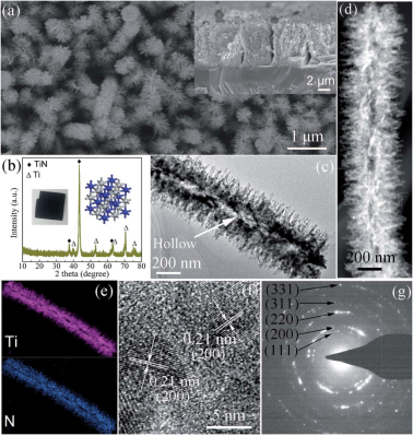 针对这一问题,近期公司文伟教授团队以复杂空心结构氮化钛合金薄膜的构筑为例,提出了“表面诱导”柯肯达尔效应,通过对固态材料的表面修饰,诱导柯肯达尔效应的产生。氮化钛(TiN)是一种金属间化合物型的合金材料,具有高电导率和高硬度的特点。利用“表面诱导”柯肯达尔效应,成功获得了具有空心结构的分级氮化钛3D阵列;用其组装的超级电容器具有“超快”充放电的能力,且具有超长的循环寿命(35万次以上)。相关成果发表于J. Mater. Chem. A期刊(中科院1区,影响因子10.733,论文链接https://pubs.rsc.org/en/content/articlelanding/2019/TA/C9TA07642E#!divAbstract),suncitygroup太阳集团为第一完成单位,论文第一作者及通讯作者为文伟教授,2016级硕士研究生姚金呈为第二作者,论文合作者包括浙江大学吴进明教授等。该研究工作得到了国家自然科学基金项目(项目编号51862005、51502065)的资助。
