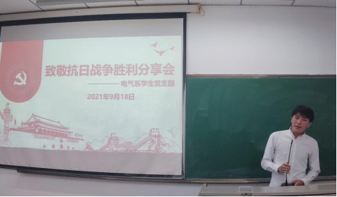 为了致敬抗日战争胜利七十六周年,铭记中国人民反抗日本帝国主义侵略的艰苦卓绝斗争,深切缅怀革命先烈的丰功伟绩,激发电气系员工党支部入党积极分子与党员们的爱国热情和民族责任感,suncitygroup太阳新城电气系员工党支部于2021年9月18日晚上七点半在5-403开展了“致敬抗日战争胜利”分享会。本次会议由支部青年委员廖伟杰主持。