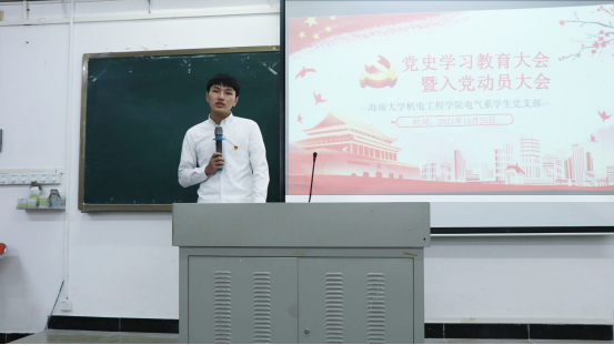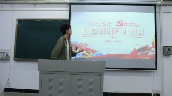 最后,青年委员廖伟杰鼓励新生积极主动地学习党史和党的基本理论,号召他们以自己的实际行动主动向党靠拢,并代表电气系员工党支部向新生们提出学习及生活上的相关建议,期待他们能够保持初心,不负韶华,努力前行。