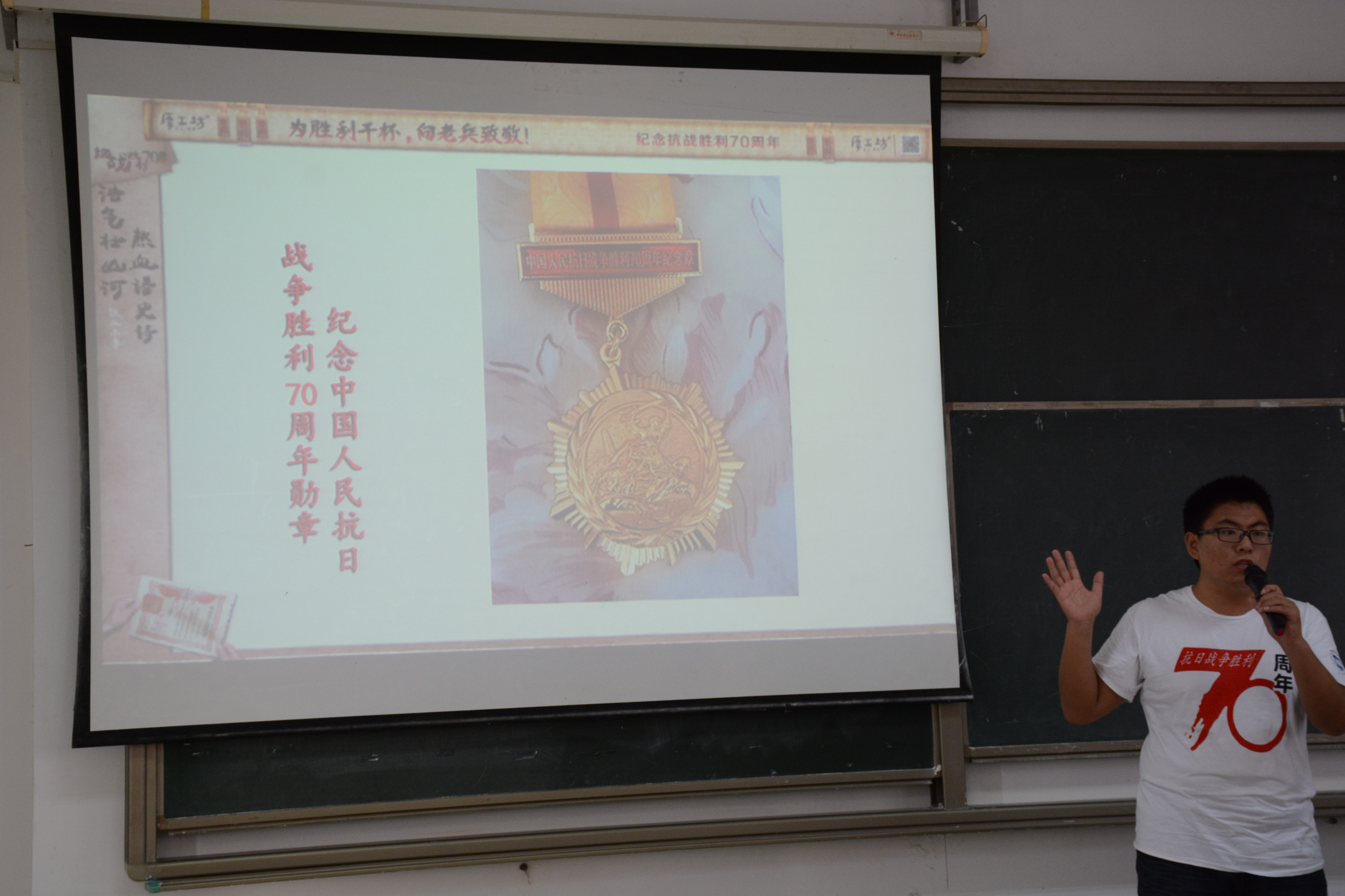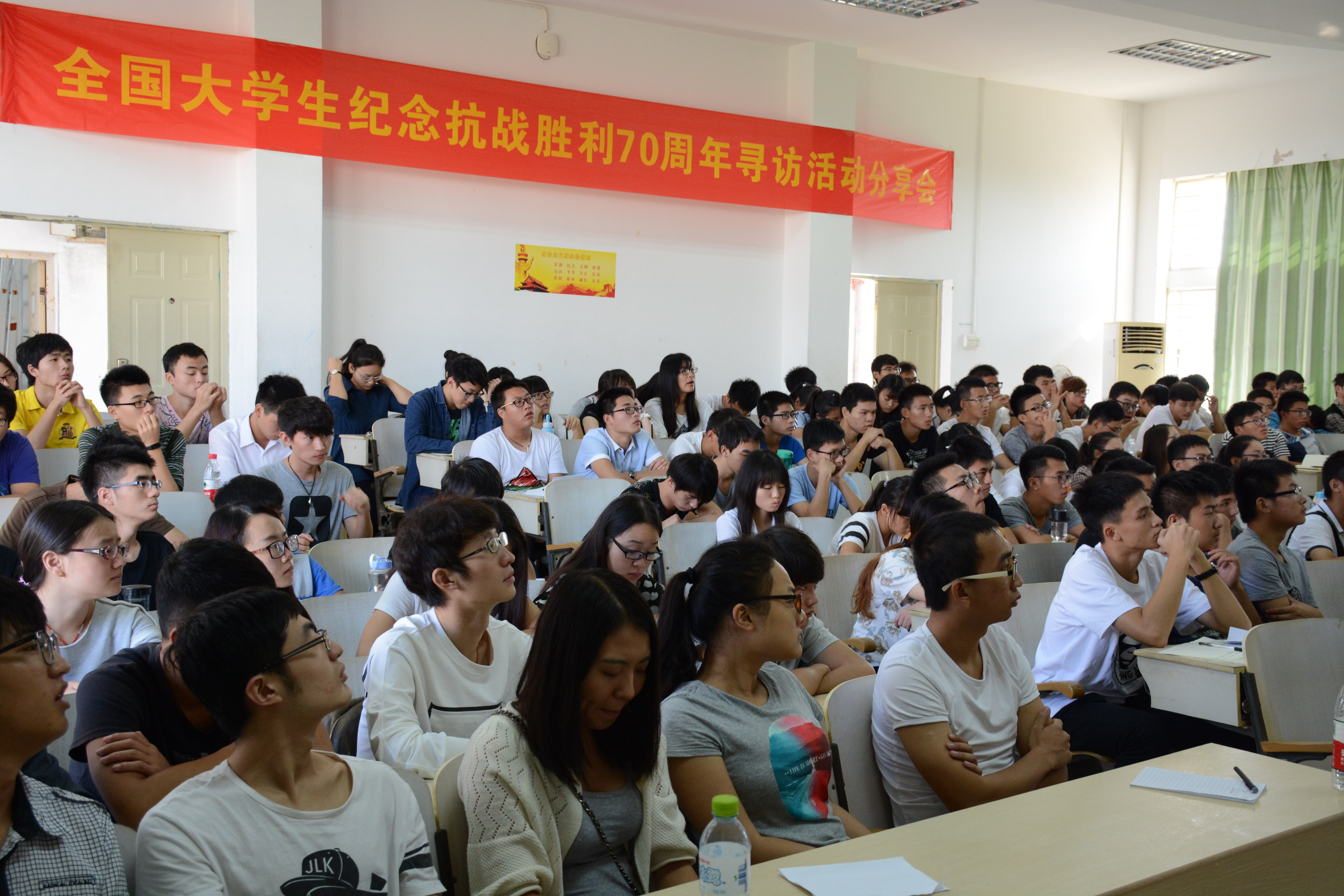 活动开始后,致远传承寻访团指导老师崔建兵讲述了全国老员工纪念抗日战争胜利70周年寻访活动的内容与意义,希望通过致远传承团队的分享,引导更多青年老员工主动、自觉地在社会实践中学习“历史课”,缅怀抗战先烈,传承革命精神。随后,团队成员一一上台与大家分享自己的寻访心得以及感悟,他们用朴实真切的言语赢得了在场同学的一次次掌声,他们的体会引起了在场同学的共鸣。接着在互动环节中,在场同学踊跃发言,积极与团队成员交流,希望以后有机会也能参加这样有意义的社会实践活动。宣讲结束后,团队成员邀请在场观众观看《抗战老兵寄语》及由海南新闻频道跟踪拍摄的视频《不能忘却的记忆》为大家展现了寻访过程中的点点滴滴,给在场观众留下了深刻的印象,也使在场同学深刻体会了抗战的艰辛与不易,懂得珍惜眼前的幸福生活。