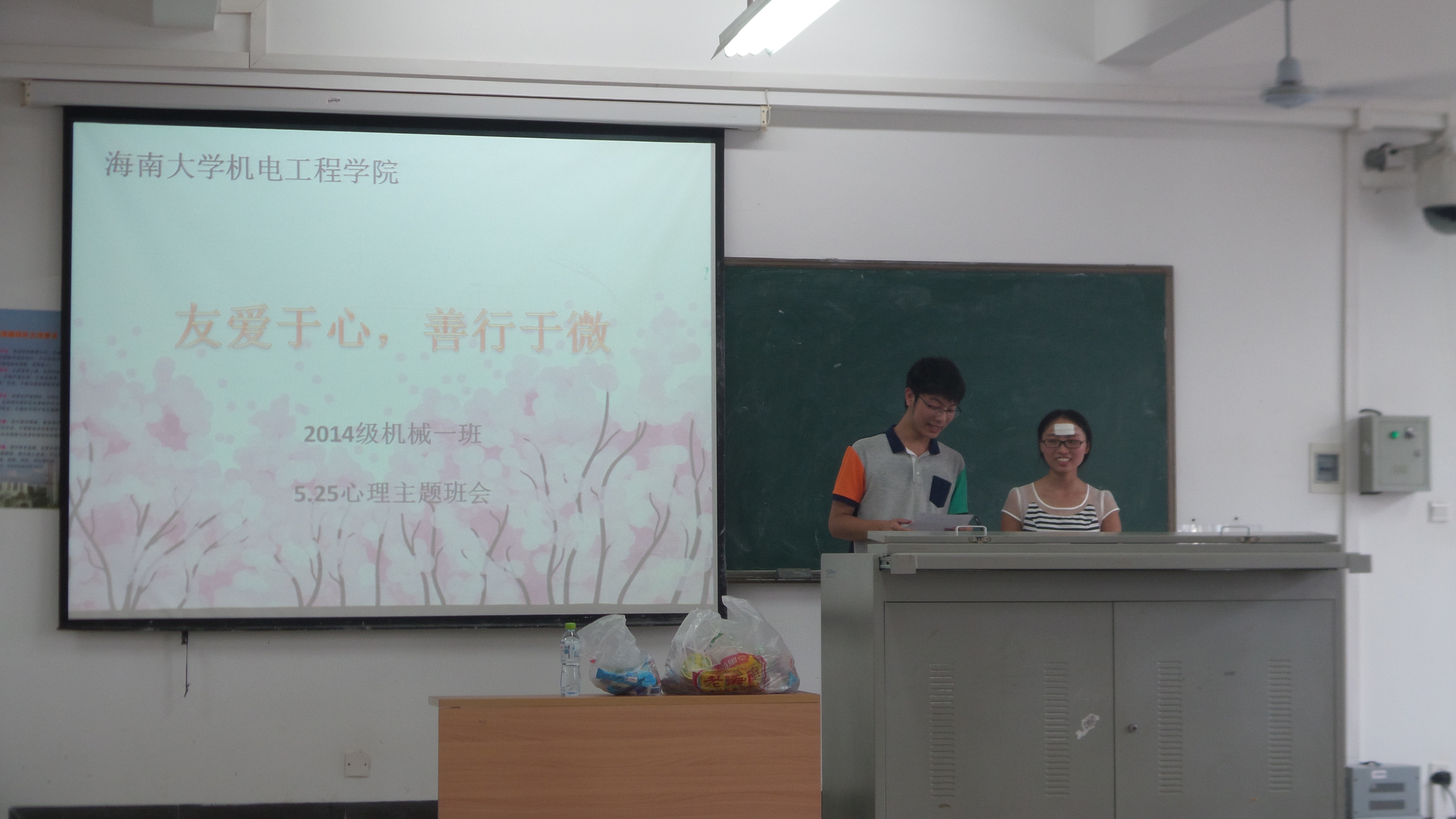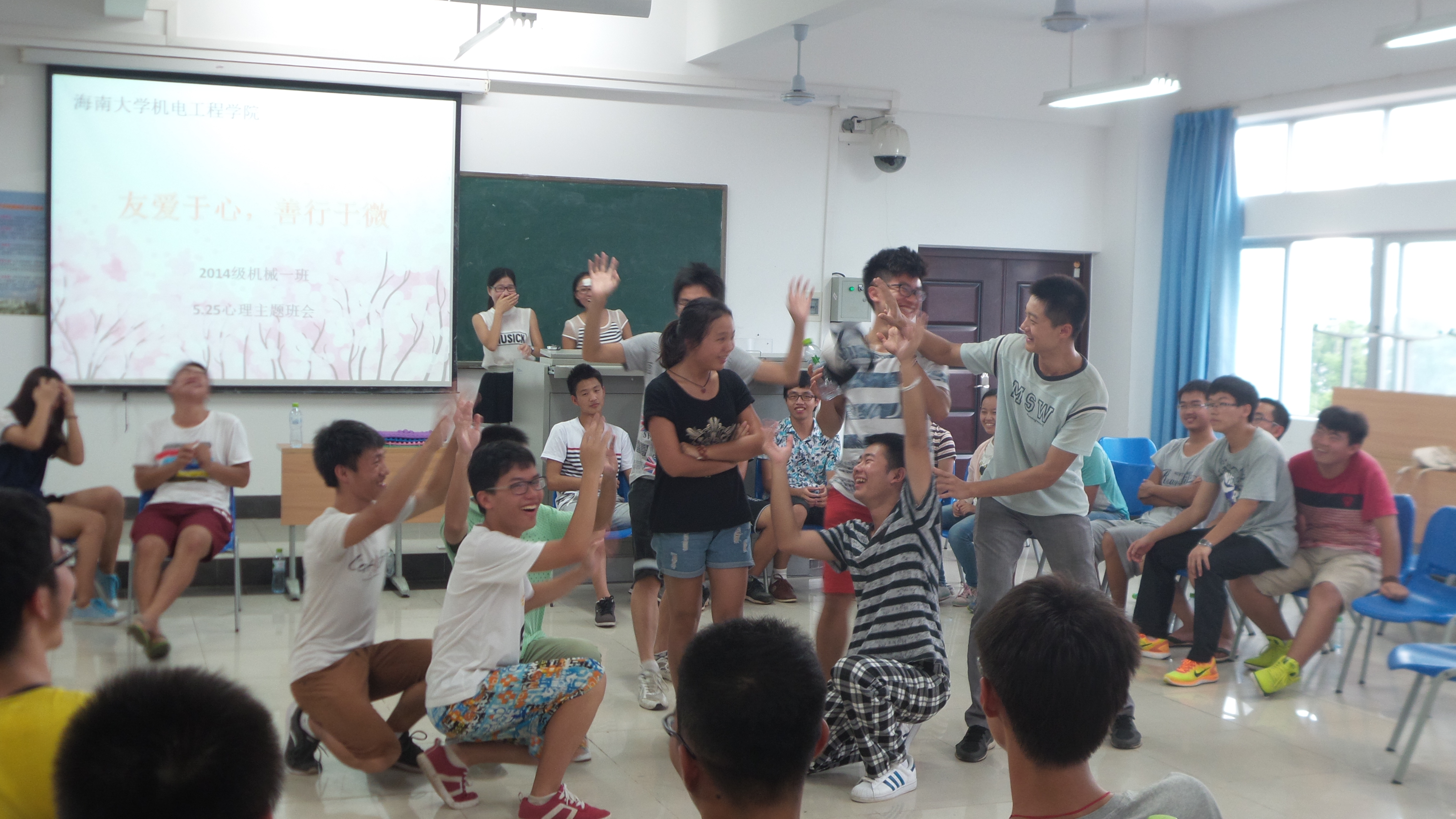 为了增强公司员工的心理健康意识,提高自我调适能力,促进老员工心理健康教育工作的开展。按照公司5.25心理活动月的统一安排,5月26日下午四点三十,2014级机械设计制造及其自动化1班在4教412举行了“友爱于心,善行于微”主题心理团体辅导班会。李青老师以及14级机械1班全体员工参加了此次班会。