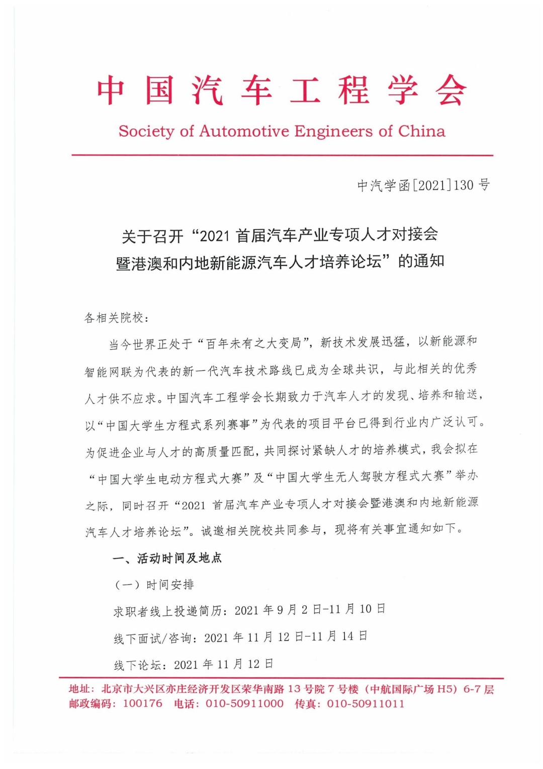 关于召开2021首届汽车产业专项人才对接会的通知(中汽学函[2021]130号)
