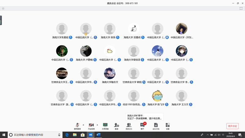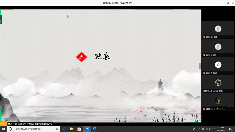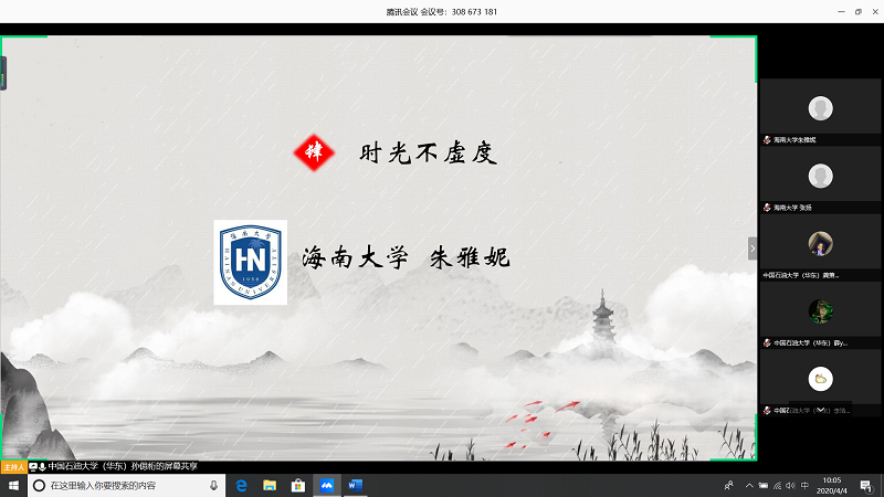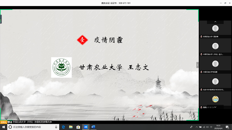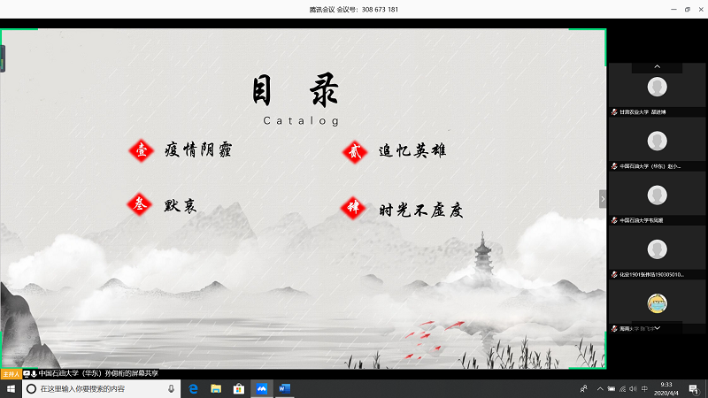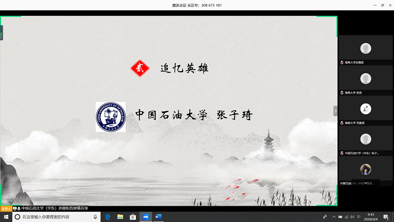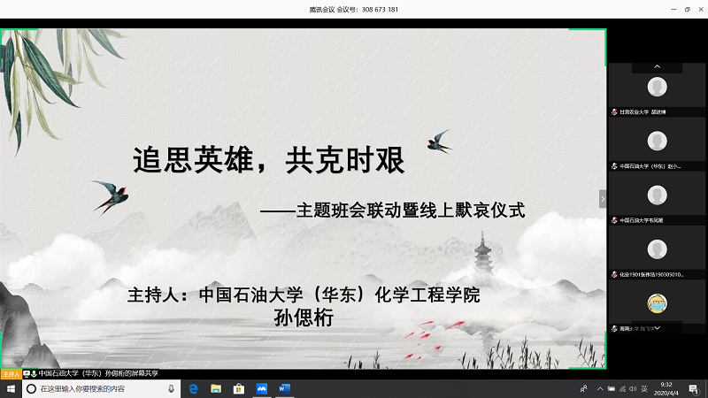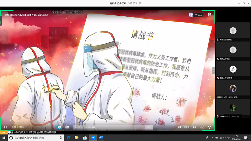 会上,由甘肃农业大学王志文同学带我们回顾疫情,虽然国内疫情已经有所缓解但是同学们还是不能放松警惕;中国石油大学(华东)张子琦同学带领大家向抗疫英雄致敬,十点开始全体起立默哀三分钟;suncitygroup太阳集团朱雅妮为大家强调线上上课等同于课堂教学,在家学习不能懈怠,合理规划疫情期间的学习和课程安排。