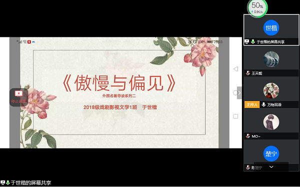 来自人文传播公司的于世楷同学向大家分享了英国现实主义文学作家简·奥斯汀的代表作《傲慢与偏见》。他简要介绍了作者并讲述了故事背景及故事梗概,通过对故事情节的分析,向大家分享了他对两位主人公的思考,字字珠玑,引得同学们在评论区发出阵阵赞许。他分享了自己的阅读感想,带领同学们一起走近那个时代的英国乡镇社会,就像《傲慢与偏见》向我们所传达的那样,第一印象并非一定是真实的,只有更加深入的了解,才能更客观认清彼此。待人待事,都是如此。