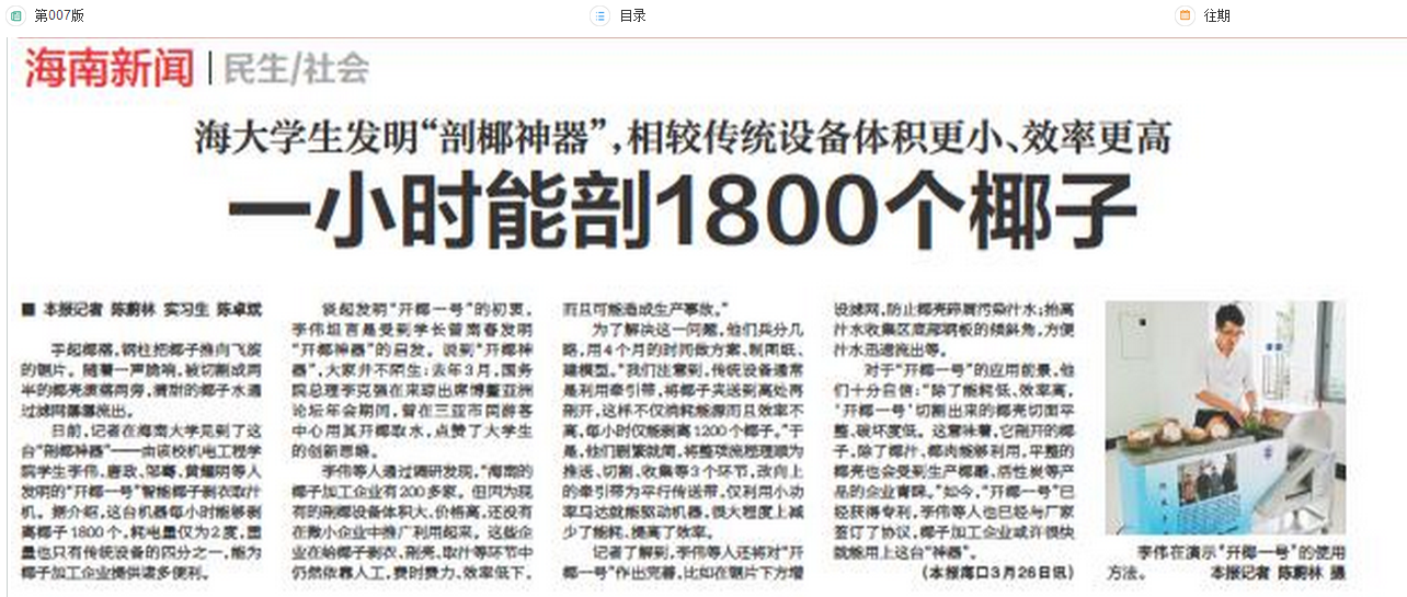 对于“开椰一号”的应用前景,他们十分自信:“除了能耗低、效率高,‘开椰一号’切割出来的椰壳切面平整、破坏度低。这意味着,它剖开的椰子,除了椰汁、椰肉能够利用,平整的椰壳也会受到生产椰雕、活性炭等产品的企业青睐。如今,“开椰一号”已经获得专利,李伟等人也已经与厂家签订了协议,椰子加工企业或将很快用上这台“神器”。