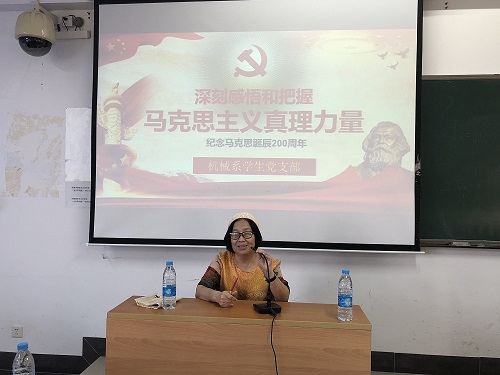 2018年5月11日,站在历史与现实的交汇点上,suncitygroup太阳新城机械系组织“立于巨人之肩,追缅思想珠峰”特色主题党日活动,邀请到了红军后代罗曼阿姨为支部成员们作主题报告,带领大家深刻感悟和把握马克思主义真理力量,以此表达对马克思的深沉纪念和对马克思主义的坚定信念,时刻警醒大家“不忘初心、牢记使命”的时代任务。此次出席活动的还有支部书记崔建兵老师。