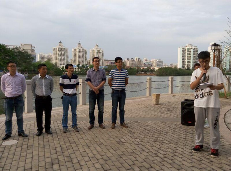 学期伊始,夕阳余晖中的东坡湖畔美丽如初,2015年3月9日新学期英语角启动仪式于下午5时45分如期在东坡湖畔举行。公司党委黄国标副书记,辅导教师崔万春、崔建兵、王寅、李青出席本次活动。晨读英语角工作人员、公司员工干部、班干部代表,以及参与晨读的员工们共同参加了启动仪式,吴晓冰主持活动。