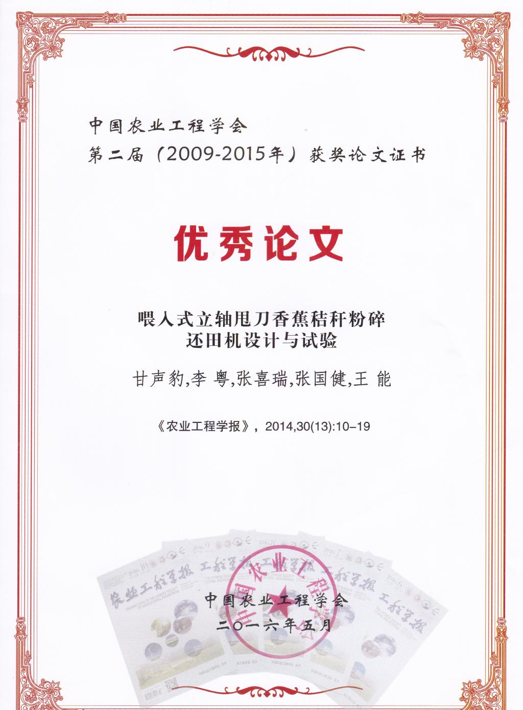 近日,公司热带作物秸秆机械化技术课题组两篇《农业工程学报》论文入选“中国农业工程学会第二届优秀论文”。两篇论文分别是“滚割喂入式卧轴甩刀香蕉假茎粉碎还田机设计与试验”(通讯作者:张喜瑞副教授)、“喂入式立轴甩刀香蕉秸秆粉碎还田机设计与试验”(通讯作者:李粤教授)。继2009年中国农业工程学会第一届优秀论文评选后,中国农业工程学会今年启动了第二届优秀论文评选。本届优秀论文评选范围是《农业工程学报》2009-2015年刊发的论文,优秀论文遴选采用文献指标定量与发表时专家评审意见定性相结合,提出候选论文,由中国农业工程学会组织专家评审。