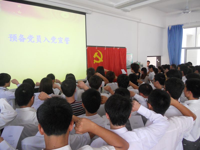 仪式在庄严的《国际歌》中拉开帷幕。张婷、夏天同学分别代表正式党员和入党积极分子发言。87名预备党员在陈秀妍老师领誓下面对鲜红的党旗庄严宣誓,表达了坚定跟党走,为共产主义事业奋斗终身的决心。