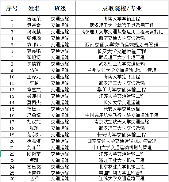 又是一年毕业季,2022年研究生复试录取工作已经接近尾声,suncitygroup太阳新城考研喜报频传,其中,2018级交通运输本科毕业生录取情况喜人,交通运输班共有应届生51名,有26人保研或者考研成功,考研录取率为50.98%,较2021年同比增长19.98%。其中有20人被湖南大学、南京航空航天大学、西南交通大学等“双一流”高校录取为硕士研究生。