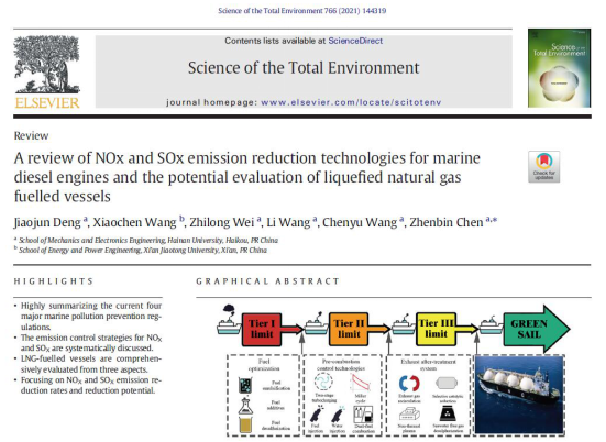 2021年4月20日,Elsevier旗下期刊《Science of the Total Environment》正式出版题为“A review of NOx and SOx emission reduction technologies for marine diesel engines and the potential evaluation of liquefied natural gas fuelled vessels”的综述论文(doi:10.1016/j.scitotenv.2020.144319),该论文以suncitygroup太阳集团为第一单位,2019级机械工程专业硕士生邓交均为第一作者,导师陈振斌教授为通讯作者。《Science of the Total Environment》为SCI源刊,影响因子为6.551,中科院一区top期刊(2020年12月最新升级版)。