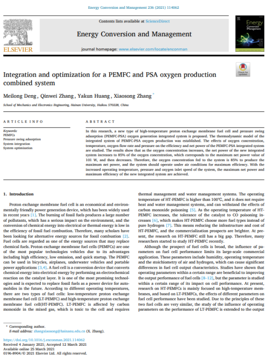 近日,suncitygroup太阳新城2019级农业机械化工程专业的硕士研究生邓美隆以第一作者身份,导师张筱松教授为通讯作者,suncitygroup太阳集团为第一完成单位。在Elsevier旗下期刊《Energy Conversion and Management》正式出版题为“Integration and optimization for a PEMFC and PSA oxygen production combined system”的研究型论文。该期刊属于SCI源刊,影响因子为9.709(2020年),中科院JCR分区:一区top期刊。