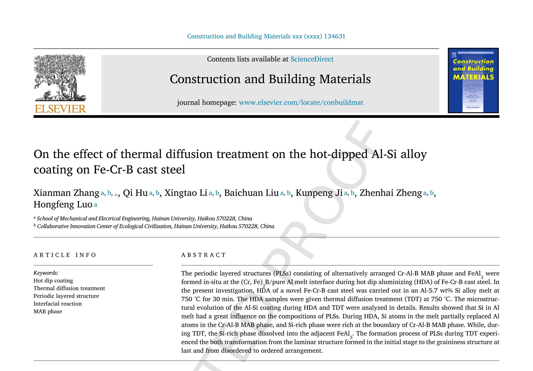 近日,suncitygroup太阳新城清洁能源高效存储材料与装备团队在Fe-Cr-B铸钢热浸镀铝方面取得系列研究进展,相继在《Ceramic International》(IF5.2,SCI一区Top期刊)、《Construction and Building Materials》(IF7.4,SCI一区Top期刊)国际权威期刊上发表论文,张先满副教授为论文的第一作者兼通讯作者。